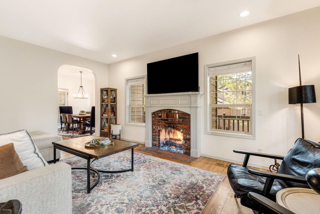 Charming, well-maintained home with a wraparound porch, ideally situated on a spacious, beautifully landscaped corner lot in Sunriver. The inviting living room features a cozy wood-burning fireplace and hardwood floors that extend through the living, kitchen and dining areas. The nicely remodeled kitchen offers a breakfast bar and sunny nook with bay window. Main level primary suite includes a gas fireplace, separate tub and shower, and marble tile flooring. Upstairs bedrooms feature dormers and built-in bunk beds, plus a bonus room with vaulted wood ceiling and gas stove. Enjoy outdoor living on the private deck with hot tub, surrounded by peaceful natural setting. Close to golf, SHARC, trails, parks, dining and The Village. Ideal as a vacation rental, second home or full-time residence.